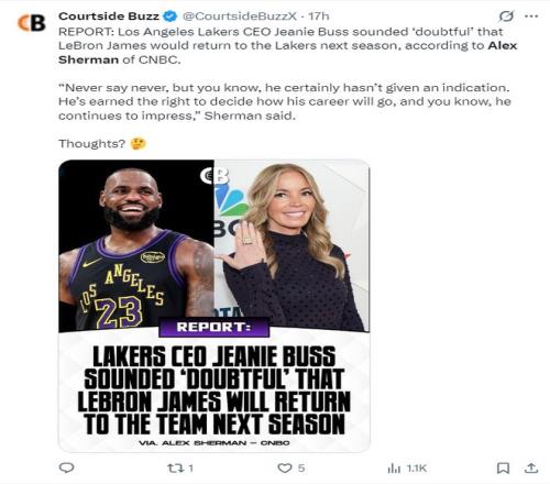 但兩小時后根據(jù),美記alex sherman的報(bào)道,湖人隊(duì)CEO珍妮-巴斯覺得勒布朗‘不太可能’會在下賽季重返湖人隊(duì)。雖然不能說詹姆斯絕對不會重返LAL,但珍妮-巴斯透露詹姆斯從來沒有任何暗示將要重返湖人,詹姆斯對自己的職業(yè)生涯有絕對的控制權(quán)。