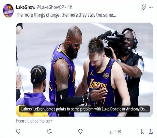 湖人媒體Laker Show發(fā)布了一篇文章,他寫道:事物變化越多,卻越是保持不變。這篇文中珍妮-巴斯透露目前湖人的重點(diǎn)是圍繞東契奇建隊(duì)而不是41歲的詹姆斯,雖然詹姆斯自2018年加盟湖人后一直是球隊(duì)門面。(因?yàn)檎材匪?260萬的合同即將到期,湖人在今夏可以清理出很多薪金空間)