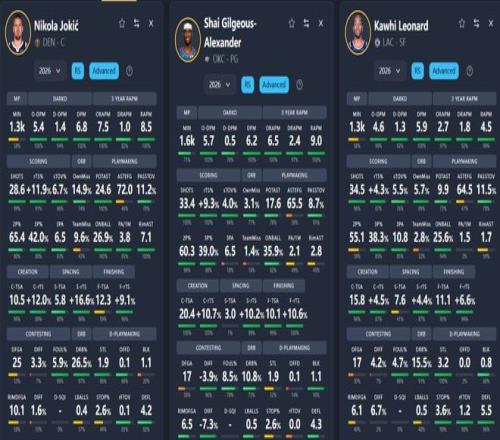 通過DPM值,不難發(fā)現(xiàn),這五位球員就是如今聯(lián)盟里的最強的5位個體。五人中,SGA代表的是極致的進(jìn)攻,他進(jìn)攻的O-DPM值高達(dá)5.7,而文班亞馬則代表極致的防守,他的D-DPM值高達(dá)2.8,是五人中唯一一位比代表進(jìn)攻貢獻(xiàn)值O-DPM值還高的一位。萊昂納德是五人中最為均衡的,他的O-DPM值為4.6,D-DPM值為1.3,是五人中兩項數(shù)據(jù)差值最小的一位。
