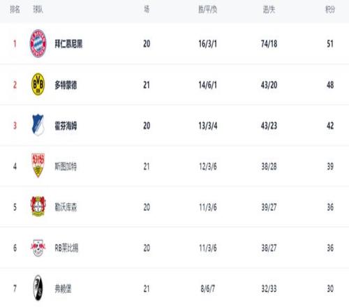 在積分榜上,拜仁依然占據(jù)榜首位置,16勝3平1負,拿到51分。而多特蒙德不斷贏球之后,總積分已經(jīng)達到48分,只落后拜仁3分。不過,多特蒙德比拜仁多踢1場?;舴液D芬?2分排名第3。第4的是斯圖加特,拿到了39分。勒沃庫森以36分排名第5。萊比錫也是36分,排名第6。勒沃庫森和萊比錫與歐冠區(qū)的差距都只有3分。弗賴堡拿到30分,排第7。