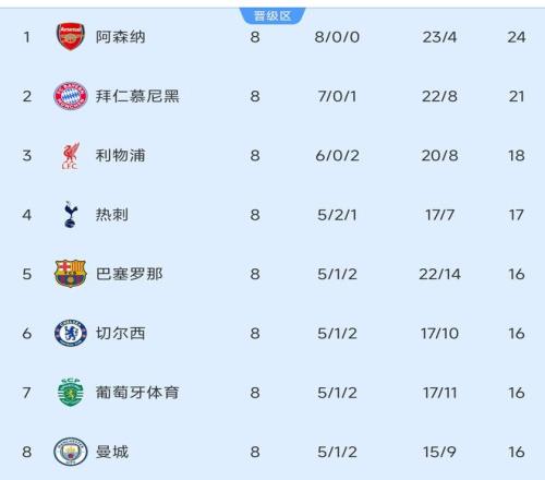 1,隨著本菲卡4-2的獲勝,皇馬的惜敗,本賽季歐冠聯(lián)賽,直接晉級(jí)的8支球隊(duì)包括:英超的阿森納、利物浦、熱刺、切爾西、曼城。多達(dá)5支!此外,德甲的拜仁、西甲的巴薩以及葡超的葡萄牙體育也直接晉級(jí)。