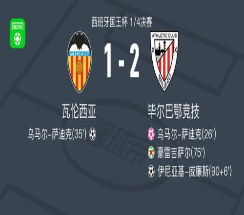 北京時(shí)間2月5日西班牙國(guó)王杯 1/4決賽,瓦倫西亞對(duì)陣畢爾巴鄂競(jìng)技。瓦倫西亞烏馬爾-薩迪克破門,烏馬爾-薩迪克自擺烏龍。畢爾巴鄂競(jìng)技伊尼亞基-威廉斯破門。最終比分瓦倫西亞 1-2 畢爾巴鄂競(jìng)技。