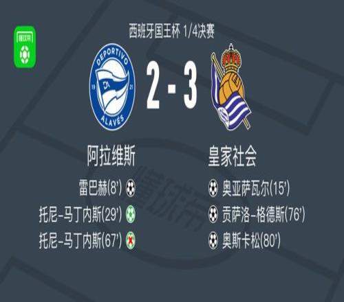 北京時間2月5日西班牙國王杯 1/4決賽,阿拉維斯對陣皇家社會。阿拉維斯雷巴赫破門,托尼-馬丁內(nèi)斯破門?;始疑鐣W亞薩瓦爾破門,貢薩洛-格德斯破門,奧斯卡松破門。最終比分阿拉維斯 2-3 皇家社會。