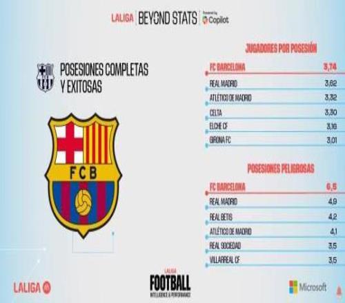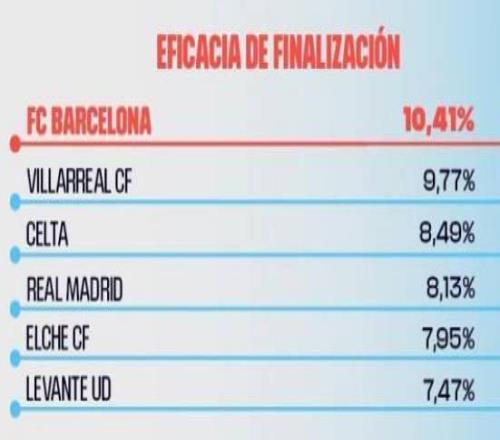 根據(jù)西甲官方列出的統(tǒng)計(jì)數(shù)據(jù),巴薩是本賽季西甲射門轉(zhuǎn)化率最高的球隊(duì),也是控球涉及人數(shù)、創(chuàng)造威脅次數(shù)最多,成功阻止對手射門比例最高的球隊(duì)。