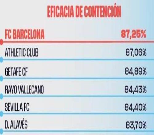 巴薩在防守中成功阻止對手完成射門的比例為87.25%,領(lǐng)先于畢爾巴鄂競技(87.06%)和赫塔費(fèi)(84.89%),成為阻止對手進(jìn)攻的最佳球隊(duì)。