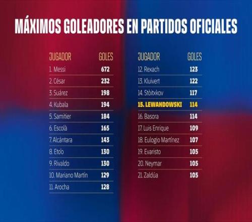 114球,萊萬升至巴薩隊史射手榜第15位