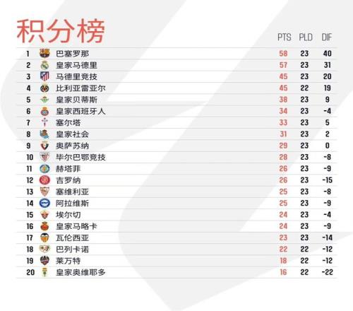 隨著今日凌晨比利亞雷亞爾4比1大勝西班牙人,除開巴列卡諾對陣皇家奧維耶多的比賽延期外,西甲第23輪的其余九場比賽全部戰(zhàn)罷。積分榜方面,巴塞羅那、皇家馬德里雙雙取勝,前者仍然以1分優(yōu)勢領(lǐng)跑西甲聯(lián)賽;馬競本輪0比1不敵皇家貝蒂斯,盡管多賽一場,但積分已被身后的比利亞雷亞爾追平,皇家貝蒂斯則緊隨其后、位列歐聯(lián)區(qū)。
