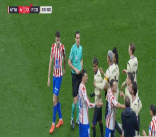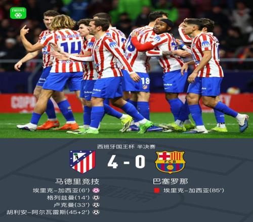 北京時(shí)間2月13日西班牙國(guó)王杯 半決賽,馬德里競(jìng)技對(duì)陣巴塞羅那。上半場(chǎng)開場(chǎng)不久,埃里克-加西亞回傳,霍安-加西亞將球停進(jìn)自家球門,隨后,巴薩后防線形同虛設(shè),格列茲曼、盧克曼,阿爾瓦雷斯相繼進(jìn)球。下半場(chǎng),埃里克-加西亞放倒單刀機(jī)會(huì)的巴埃納,裁判出示紅牌將其罰下。最終比分馬競(jìng) 4-0 巴薩。