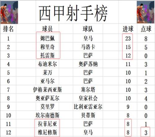 射手榜方面,姆巴佩缺陣,還是23球領跑,穆里奇15球位列第2,托雷斯12球排在第3。維尼修斯今天無緣帽子戲法,但是點射梅開二度后,他追上了拉菲尼亞和埃爾南德斯,8球剛好擠入前十。