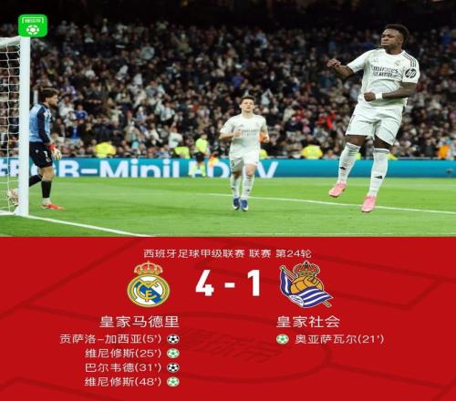 北京時(shí)間2月15日西班牙足球甲級(jí)聯(lián)賽 聯(lián)賽 第24輪,皇家馬德里主場(chǎng)對(duì)陣皇家社會(huì)。上半場(chǎng),阿諾德助攻,貢薩洛-加西亞破門。赫伊森送點(diǎn),奧亞薩瓦爾主罰命中。維尼修斯造點(diǎn)并親自罰入,卡雷拉斯助攻,巴爾韋德破門。下半場(chǎng),維尼修斯再次造點(diǎn)并親自罰入。全場(chǎng)比賽結(jié)束,皇馬4-1擊敗皇家社會(huì),取得西甲聯(lián)賽8連勝,并且在先賽一場(chǎng)的情況下暫時(shí)超越巴薩排名西甲榜首。