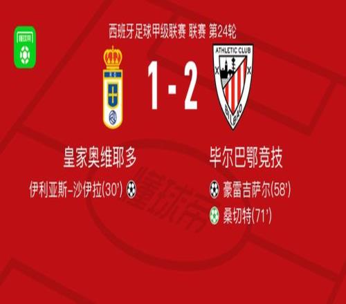 北京時間2月15日西班牙足球甲級聯(lián)賽 聯(lián)賽 第24輪,皇家奧維耶多主場對陣畢爾巴鄂競技?;始見W維耶多伊利亞斯-沙伊拉破門。畢爾巴鄂競技豪雷吉薩爾破門,桑切特破門。最終比分皇家奧維耶多 1-2 畢爾巴鄂競技。