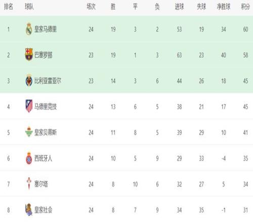 在積分榜上,皇馬以60分排名榜首。皇馬的戰(zhàn)績是19勝3平2負(fù)。巴薩則以58分屈居第2名。不過,巴薩比皇馬少踢1輪,接下來有機(jī)會(huì)重登榜首。比利亞雷亞爾45分排名第3。馬競慘敗之后,依然是45分,但凈勝球比比利亞雷亞爾少,跌到了第4名?;始邑惖偎冠A球后,總積分是41分,繼續(xù)縮小與身前球隊(duì)的差距,排名第5,距離歐冠區(qū)越來越近。西班牙人拿到35分,排名第6。
