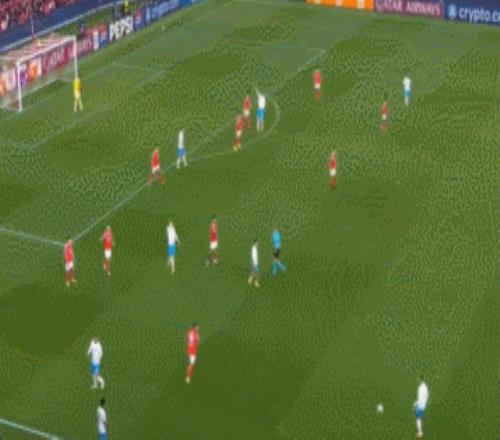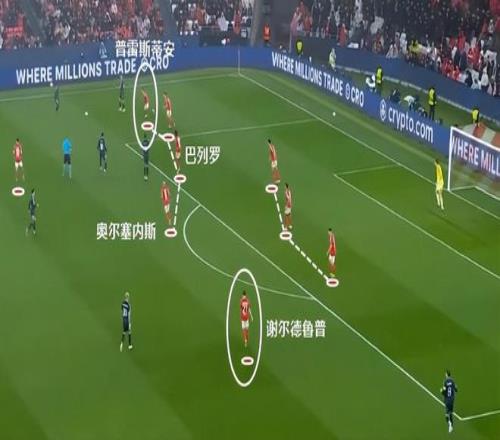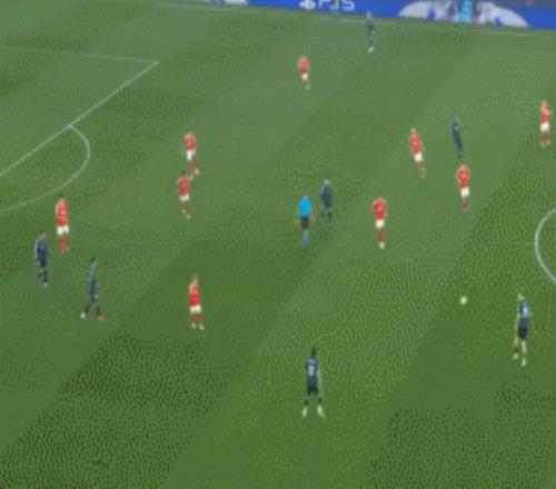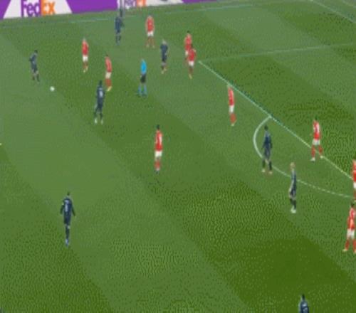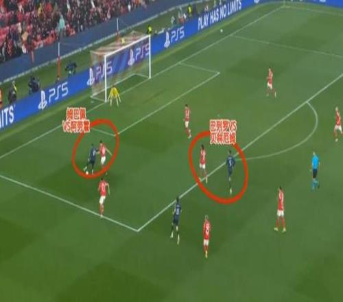 這一波的防守,最初就是邊鋒普雷斯蒂安尼退防到邊后衛(wèi)身側(cè)限制拿球的卡雷拉斯。皇馬這邊回傳后,本菲卡又讓后腰巴列羅卡在肋部,讓皇馬很難對(duì)禁區(qū)內(nèi)發(fā)起進(jìn)攻。