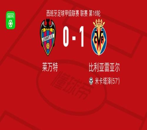 北京時間2月19日西班牙足球甲級聯(lián)賽 聯(lián)賽 第16輪,萊萬特主場對陣比利亞雷亞爾。比利亞雷亞爾米卡塔澤破門。最終比分萊萬特 0-1 比利亞雷亞爾。