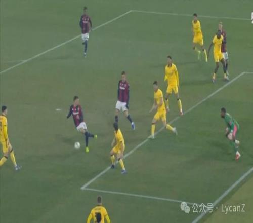 10′10″,博洛尼亞逼搶前場(chǎng)完成斷球,直接形成4V4面對(duì)米蘭后衛(wèi),在弧頂機(jī)會(huì)和下底選擇中,羅維選擇自己?jiǎn)胃?,突入禁區(qū)也晃開了加比亞重心,受到推搡但沒(méi)有吹罰。