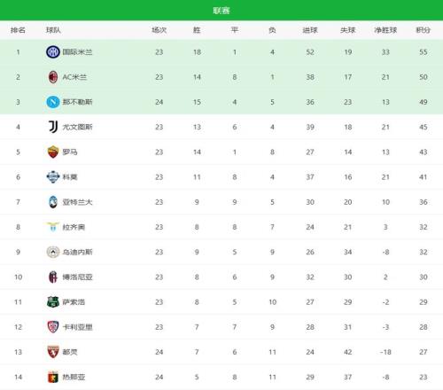 目前意甲積分榜如下:國(guó)際米蘭依舊領(lǐng)跑,18勝1平4負(fù)積55分,占據(jù)主動(dòng);AC米蘭以50分緊追其后;那不勒斯憑借這場(chǎng)極限絕殺來(lái)到49分,但比前兩名多賽一場(chǎng),容錯(cuò)空間并不大。尤文圖斯45分暫列第四,羅馬、科莫緊隨其后,爭(zhēng)四集團(tuán)之間的差距不大,而亞特蘭大、拉齊奧的起伏表現(xiàn),也讓歐戰(zhàn)資格之爭(zhēng)充滿變數(shù)。