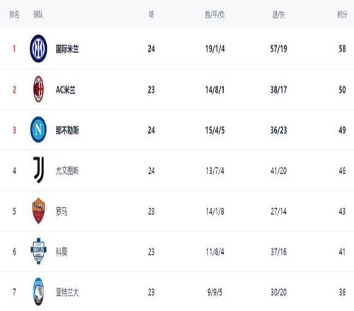 在積分榜上,國際米蘭一枝獨秀,19勝1平4負的成績非常亮眼,拿到58分高居榜首。而AC米蘭只拿到50分。雖然AC米蘭少賽一場,但與國際米蘭這么大的差距想要追上去難度極高。那不勒斯只拿到49分,排名第3,爭冠希望極其渺茫。尤文圖斯戰(zhàn)平后,總積分達到46分,排名第4。羅馬以43分排名第5??颇獎t以41分排名第6。亞特蘭大只拿到36分,排名第7。而錯失勝利的拉齊奧只拿到33分,排名第8。
