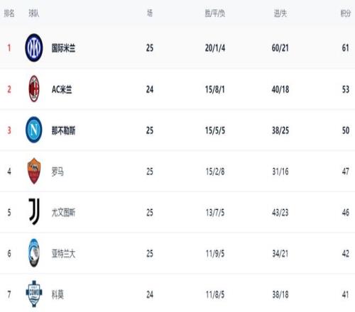 在積分榜上,國際米蘭高居榜首,拿到61分,距離冠軍越來越近。AC米蘭53分排名第2,足足落后8分。不過,AC米蘭少踢1輪。那不勒斯戰(zhàn)平之后,總積分是50分,排名第3。而羅馬則超越了尤文圖斯,升到了第4名。羅馬總積分是47分,尤文圖斯則拿到46分。亞特蘭大42分排第6。第7的是科莫,拿到41分。