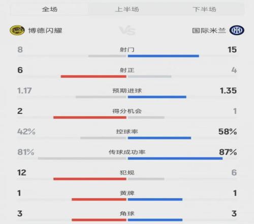 反觀國米,全場比賽的表現(xiàn)堪稱“離譜”。從數(shù)據(jù)上看,他們看似占據(jù)絕對優(yōu)勢:58%的控球率、15次射門,遠超博德閃耀的42%控球和8次射門,但效率卻低得令人發(fā)指——僅4次射正,只靠埃斯波西托的進球勉強挽回顏面。而博德閃耀則將“效率為王”發(fā)揮到極致,8次射門6次射正,3次洞穿國米球門,每一次反擊都精準致命,讓意甲豪門的后防線形同虛設(shè)。