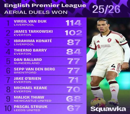 在第23輪戰(zhàn)罷后,Squawka統(tǒng)計了本賽季英超贏得空中對抗數據,利物浦中衛(wèi)范戴克高居榜首,成功率也最高。