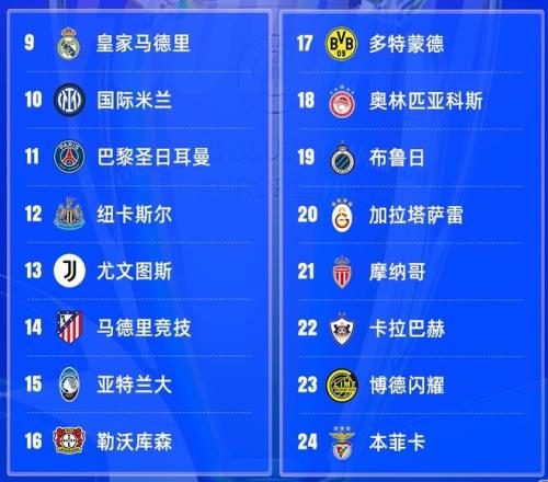 附加賽區(qū)包括了皇馬、國米、巴黎、紐卡、尤文、馬競、亞特蘭大、勒沃庫森這八支實力不俗的種子球隊,及多特蒙德、奧林匹亞科斯、布魯日、加拉塔薩雷、摩納哥、卡拉巴赫、博德閃耀、本菲卡這八支不是種子卻實力不俗的球隊。接下來會靠專門給到的抽簽來決定對陣順序,勝者晉級淘汰賽。