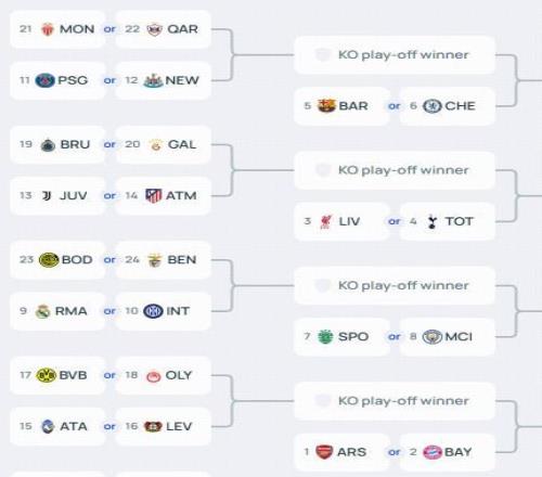 淘汰賽附加賽抽簽將根據(jù)聯(lián)賽階段的排名進行分組,其中9-16名的隊伍為種子隊,17-24名的隊伍為非種子隊,種子隊將在兩回合比賽中先客后主。