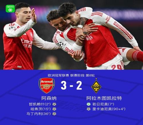 北京時間1月29日歐洲冠軍聯(lián)賽 聯(lián)賽階段 第8輪,阿森納對陣阿拉木圖凱拉特。阿森納哲凱賴什破門,哈弗茨破門,馬丁內(nèi)利破門。阿拉木圖凱拉特若日尼奧破門,里卡迪尼奧破門。最終比分阿森納 3-2 阿拉木圖凱拉特。