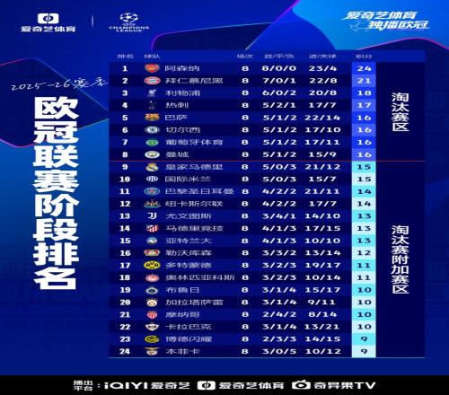 阿森納8戰(zhàn)全勝以聯(lián)賽階段第一晉級(jí)16強(qiáng),利物浦、熱刺、切爾西、曼城均進(jìn)入前八,紐卡第12名將參加淘汰賽附加賽。