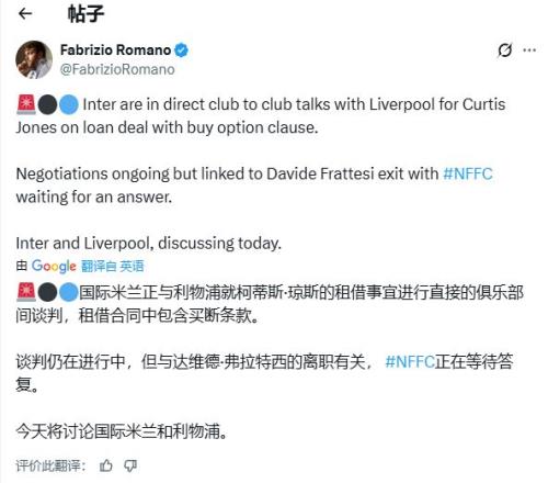 羅馬諾在X(推特)上表示:“國(guó)際米蘭正與利物浦就柯蒂斯·瓊斯的租借交易進(jìn)行了俱樂部層面談判,該交易包含購(gòu)買選擇權(quán)條款。談判正在進(jìn)行中,但與弗拉泰西的離隊(duì)相關(guān),諾丁漢森林正在等待答復(fù)?!?/p>