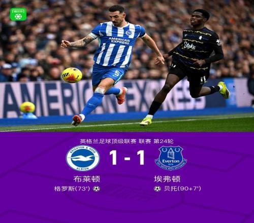 北京時(shí)間1月31日英格蘭足球頂級聯(lián)賽 聯(lián)賽 第24輪,布萊頓主場對陣埃弗頓。布萊頓格羅斯破門。埃弗頓貝托破門。最終比分布萊頓 1-1 埃弗頓。