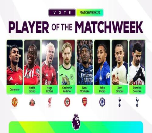 北京時間2月3日,英超官方公布了第24輪比賽的最佳球員候選名單,其中卡塞米羅、埃基蒂克、馬杜埃凱、若昂-佩德羅、哈維-西蒙斯、索蘭克等球員在列。