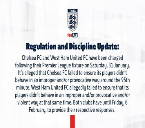 切爾西和西漢姆聯(lián)因?yàn)?月31日的英超比賽被指控,據(jù)稱,切爾西未能確保其球員在第95分鐘時(shí)沒有不當(dāng)和/或挑釁行為,而西漢姆聯(lián)被指控未能確保其球員在同一時(shí)間沒有不當(dāng)、挑釁和/或暴力行為,兩家俱樂部需在2月6日之前提交各自的回應(yīng)。(公告完)