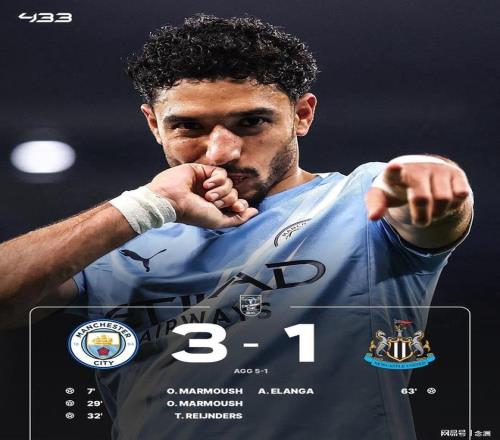 英格蘭聯(lián)賽杯半決賽次回合,曼城主場(chǎng)3-1紐卡斯?fàn)?,總比?-1晉級(jí)決賽,將對(duì)陣阿森納。馬爾穆什梅開二度,賴因德斯破門,伊蘭加扳回一球。