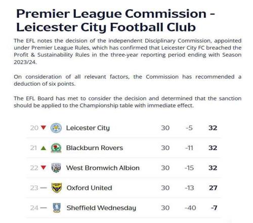 一紙官方公告,讓英格蘭足壇再次震動。北京時間2月6日,英格蘭足球聯(lián)賽(EFL)正式宣布:萊斯特城因違反盈利與可持續(xù)發(fā)展規(guī)則(PSR),被扣除6個英冠聯(lián)賽積分。盡管違規(guī)發(fā)生在2023-24賽季,且萊斯特城當賽季已經(jīng)完成升級,但財務(wù)問題違規(guī)事實確鑿,“秋后算賬”那不跑不了的,處罰即刻生效,不設(shè)緩沖期。
