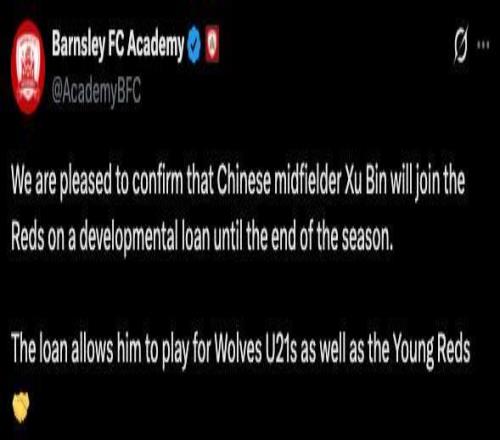 巴恩斯利青訓(xùn)學(xué)院的官方公告是:“我們很高興地確認,中國中場球員徐彬?qū)⒆鳛榘l(fā)展性租借球員加盟巴恩斯利,租借期將持續(xù)至本賽季結(jié)束。這筆租借將允許他同時代表狼隊U21及巴恩斯利青年隊出戰(zhàn)。