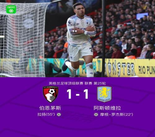 北京時(shí)間2月7日英格蘭足球頂級(jí)聯(lián)賽 聯(lián)賽 第25輪,伯恩茅斯主場(chǎng)對(duì)陣阿斯頓維拉。伯恩茅斯拉揚(yáng)破門(mén)。阿斯頓維拉摩根-羅杰斯破門(mén)。最終比分伯恩茅斯 1-1 阿斯頓維拉。