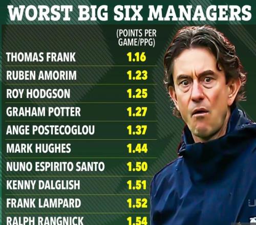 《太陽報》指出,托馬斯-弗蘭克是英超歷史上BIG6豪門里戰(zhàn)績最差的正式主教練,場均僅1.16分,已經比阿莫林還少。