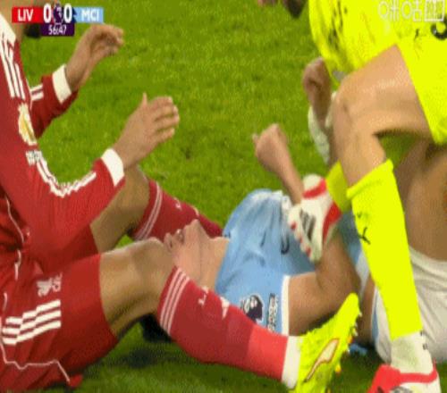 第47分鐘,范戴克踢倒哈蘭德,被出示黃牌