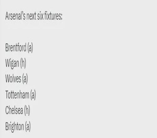 阿森納未來(lái)6場(chǎng)比賽:客戰(zhàn)布倫特福德、主戰(zhàn)維岡、客戰(zhàn)狼隊(duì)、客戰(zhàn)熱刺、主戰(zhàn)切爾西、客戰(zhàn)布萊頓。