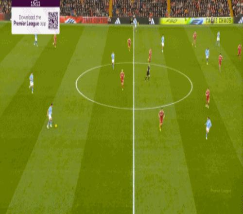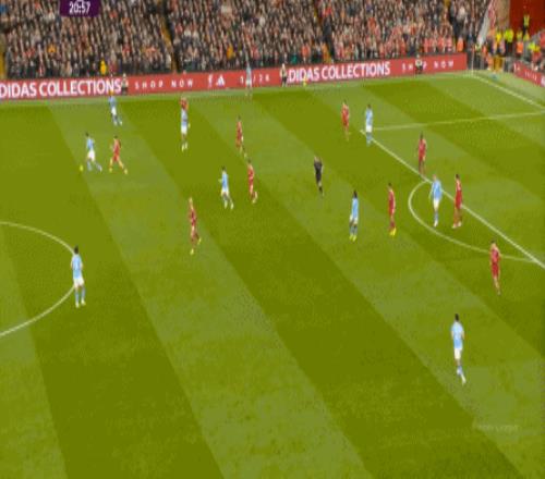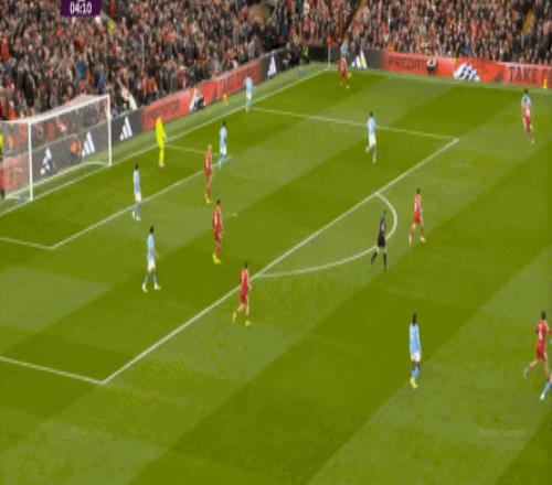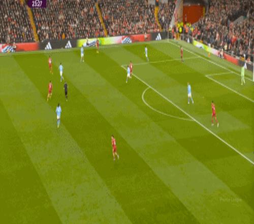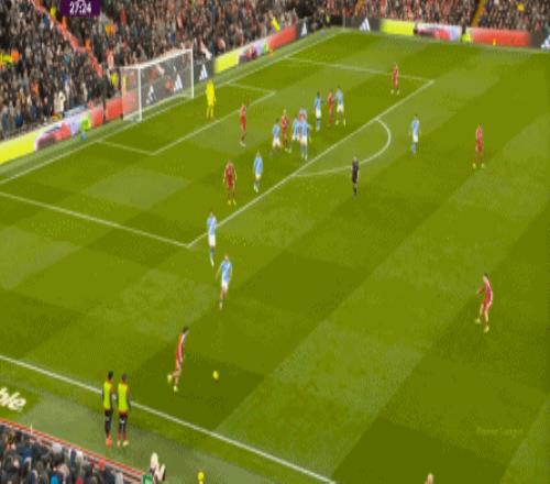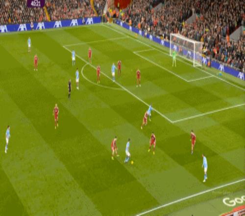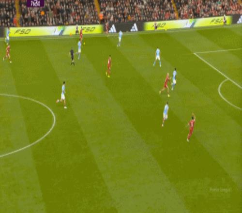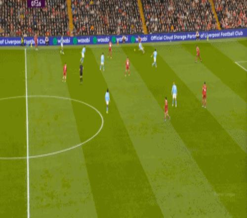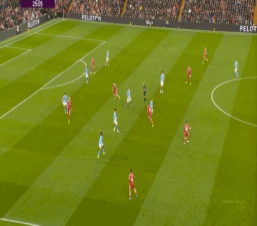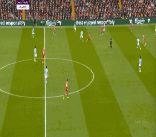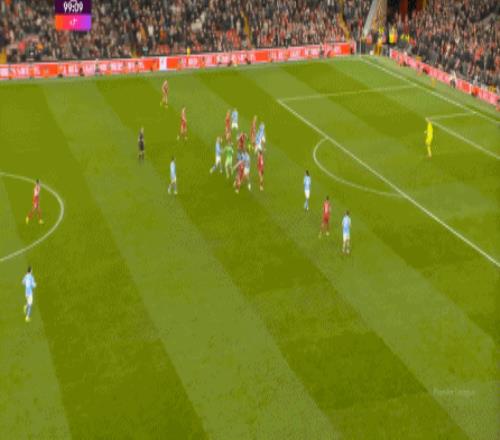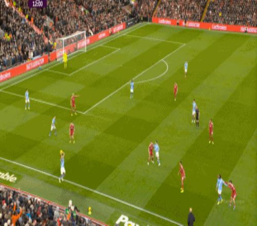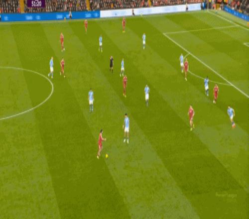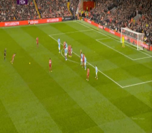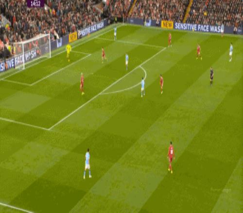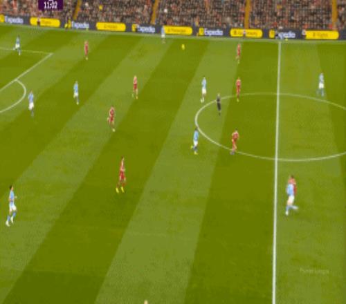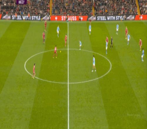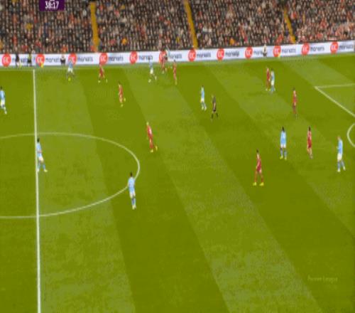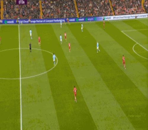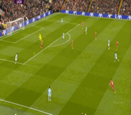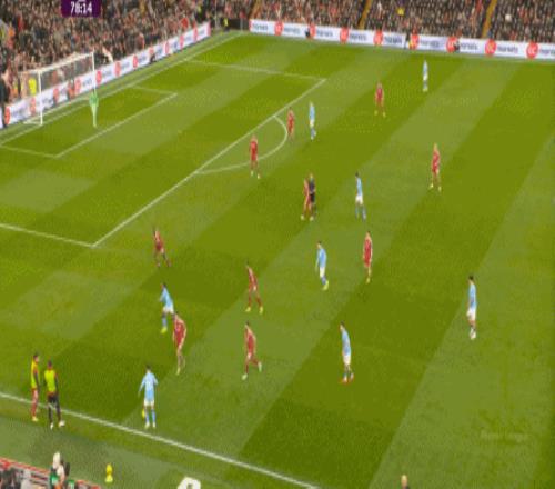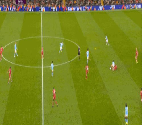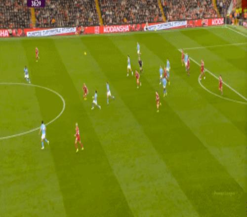 這在戰(zhàn)術(shù)上不會有特別明顯的變化,所以曼城的表現(xiàn)并未立刻改善,于是在第73分鐘,利物浦在由左至右的轉(zhuǎn)移過程中打出進(jìn)攻,隨后在二點爭奪中制造了定位球: