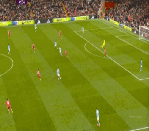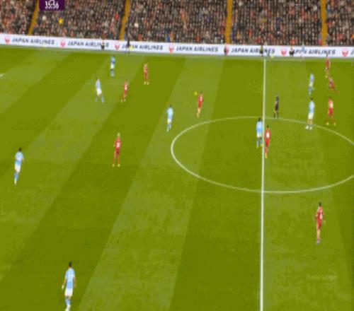 當(dāng)然了,利物浦的進(jìn)攻威脅程度和曼城還是沒法比,薩拉赫的確不負(fù)當(dāng)年之勇,但?;倏撕途S爾茨也沒有什么像樣的表現(xiàn),所以曼城很快重新掌握大局,在第33分鐘,用利物浦的失誤和自身的跑位,帶著維爾茨的羅德里在右路送出了傳中: