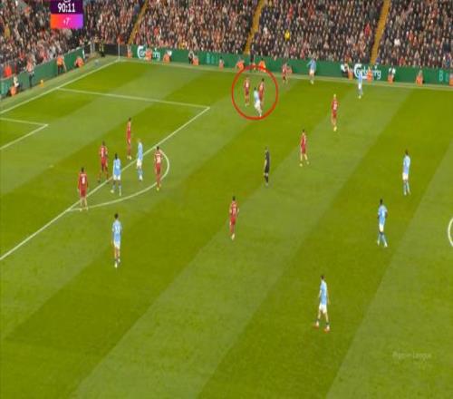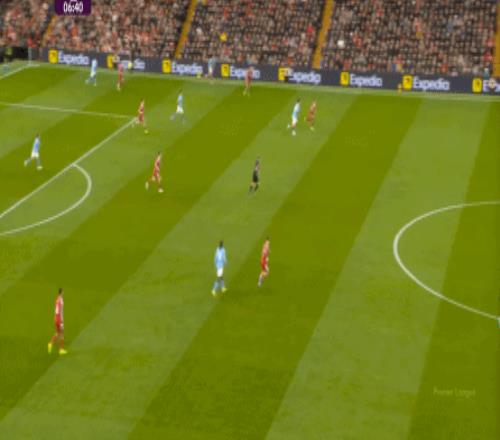 曼城則在中路持續(xù)制造著利物浦的盯人和防守空當(dāng):