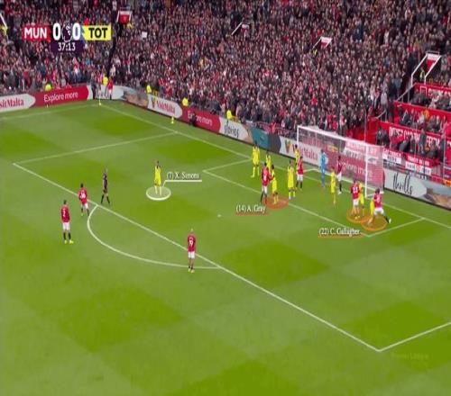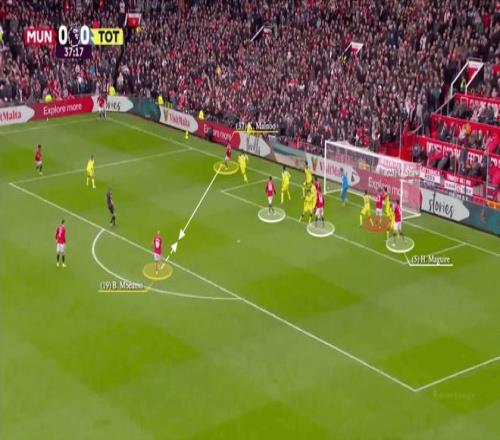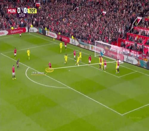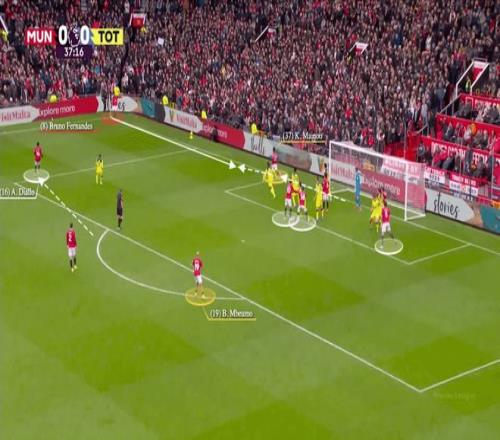 熱刺只有哈維·西蒙斯一人防守禁區(qū)前,而曼聯(lián)安排了阿馬德、姆貝莫和迪奧古·達洛站在那里。阿馬德佯裝去接B費開戰(zhàn)術(shù)角球,帶走了西蒙斯,結(jié)果實際接應(yīng)的是梅諾,姆貝莫得以獲得充足的射門空間。