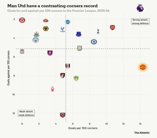 數(shù)據(jù)顯示,曼聯(lián)本賽季平均100個角球可以打入14.3球,在英超排名第一。當然,球隊在防守角球時仍然脆弱,平均100次角球丟7.1球,也是全英超最高。
