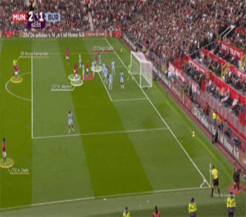 曼聯(lián)的有些定位球沒啥特別套路,就是簡單的傳中到位,搶點及時,頭球出色,馬奎爾、卡塞米羅、德里赫特和謝什科等頭球出色的球員功不可沒,負責主罰的通常是布魯諾·費爾南德斯右腳主罰左側(cè)角球,姆貝莫左腳主罰右側(cè)角球,踢內(nèi)側(cè)弧線球;任意球則基本由B費包辦。
