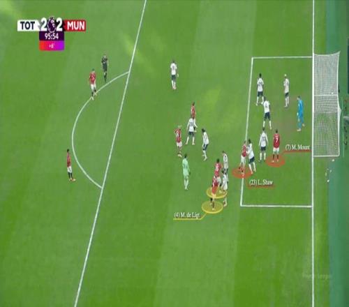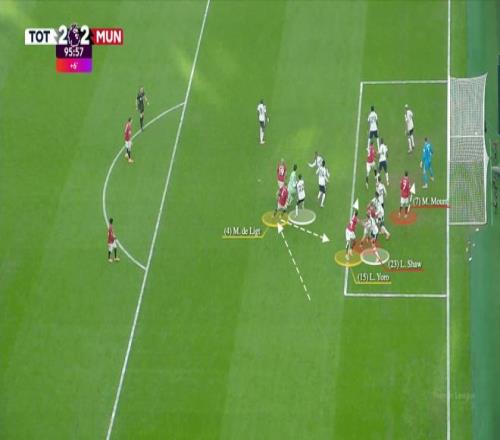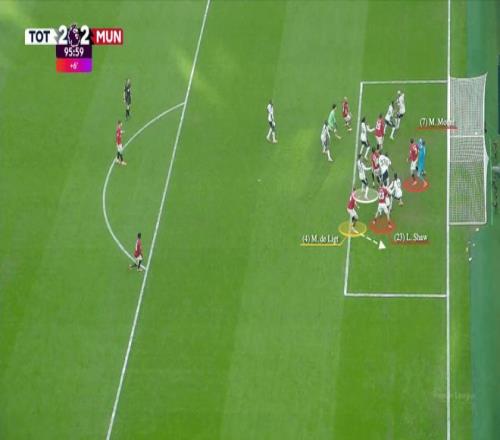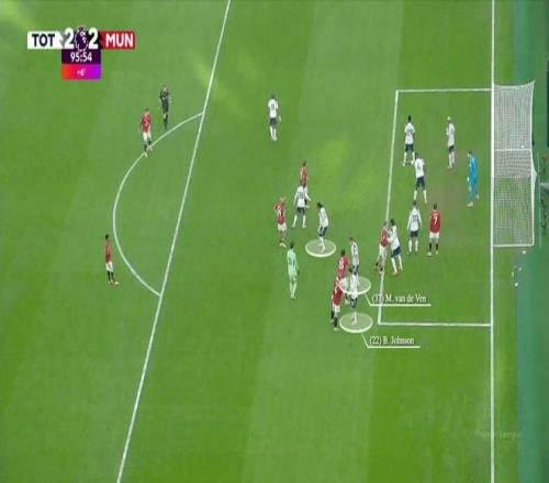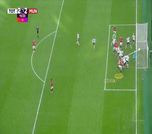 曼聯(lián)客場與熱刺的比賽最后時刻,塞納·拉門斯也殺到門前充當幌子,德里赫特因此在后點無人防守頭球絕平。