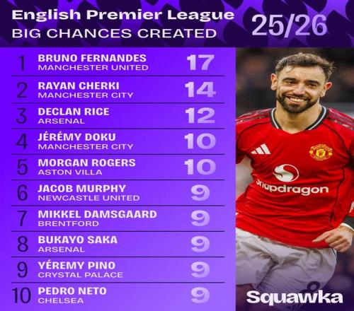 25/26賽季英超創(chuàng)造重大機(jī)會(huì)榜