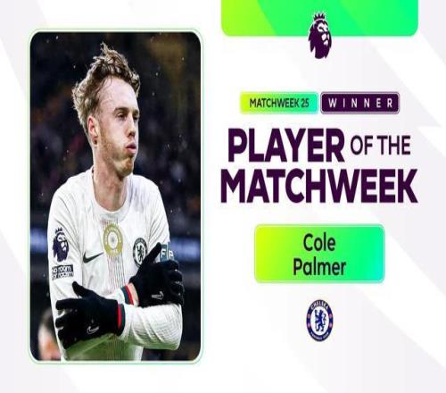 切爾西攻擊手科爾-帕爾默在球隊3-1客勝狼隊的比賽中發(fā)揮驚艷,當選英超第25輪最佳球員。