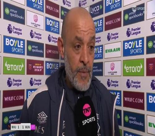 英超第26輪一場(chǎng)較量,西漢姆聯(lián)主場(chǎng)被曼聯(lián)絕平。賽后,鐵錘幫主帥努諾接受了TNT體育的采訪。