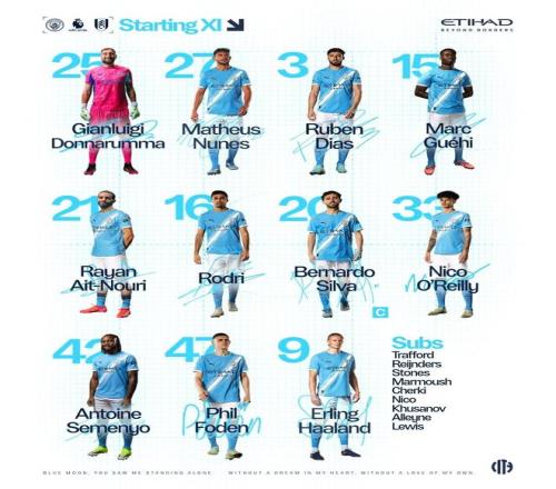 曼城首發(fā):25-多納魯馬、27-馬特烏斯-努內(nèi)斯、3-魯本-迪亞斯、15-格伊、21-艾特-努里、16-羅德里、20-伯納多-席爾瓦、33-尼科-奧賴?yán)?2-塞門約、47-福登、9-哈蘭德